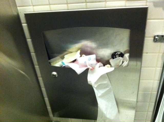 This monstrosity of menstruation occurred within a few hours. Only a few hours–I KNOW! It seems impossible that a few women could bleed that much! I guess you could attribute part of it to the fact that there seems to be a “favorite stall” in the bathroom, the first one on the far right. I don’t know why it’s a favorite stall, but in an otherwise empty bathroom, it’s the only one that’s always occupied. So this is where all the period garbage ends up. This is where it overflows in a matter of hours. (Someone should really do some kind of scientific study on why everyone wants to bleed in that particular stall. Someone who is not me.)