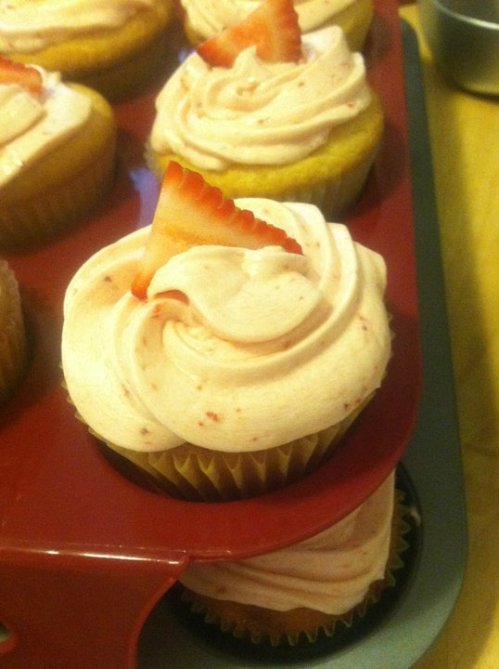What to do with all the leftover strawberry puree? Well, I cored some of the lemon cupcakes and piped some puree in there. Then I frosted the tops with the strawberry frosting and put them in the fridge with a little strawberry slice for a hat. The result was a lemony treat with nice cold strawberry-lemon flavored cake in the middle. I bet this would work really well with the coconut cupcake or the banana cupcake and maybe swap out the strawberry for frozen mango or pineapple? That would make a damn good summer cupcake.